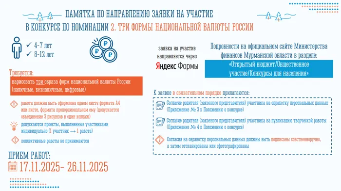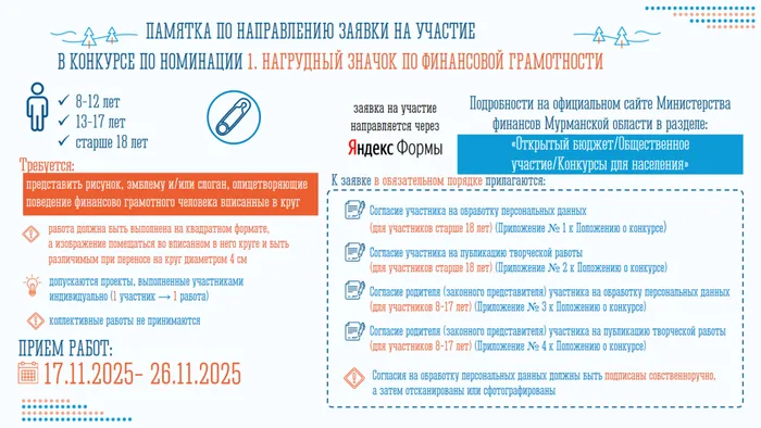 С информацией о сроках проведения, условиях конкурса, а также Положением о конкурсе творческих проектов «Бюджет для граждан» в 2025 году, можно ознакомиться на сайте Министерства финансов Мурманской области в разделе «Открытый бюджет/Общественное участие/Конкурсы для населения/Конкурс творческих проектов «Бюджет для граждан». 2025 год»/